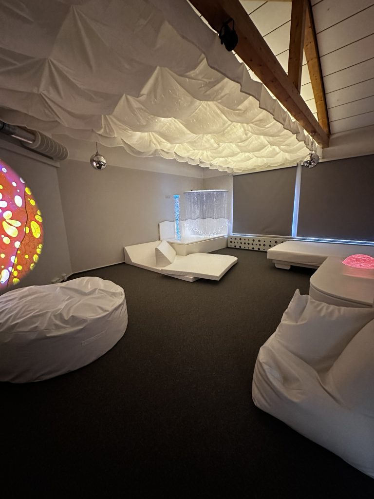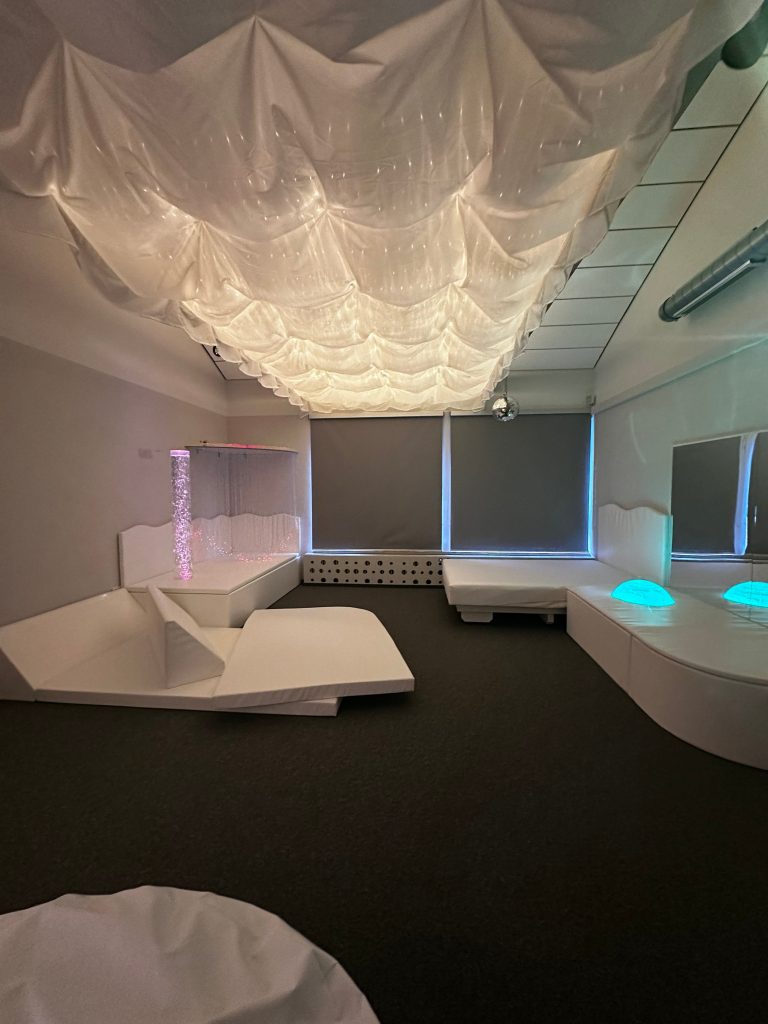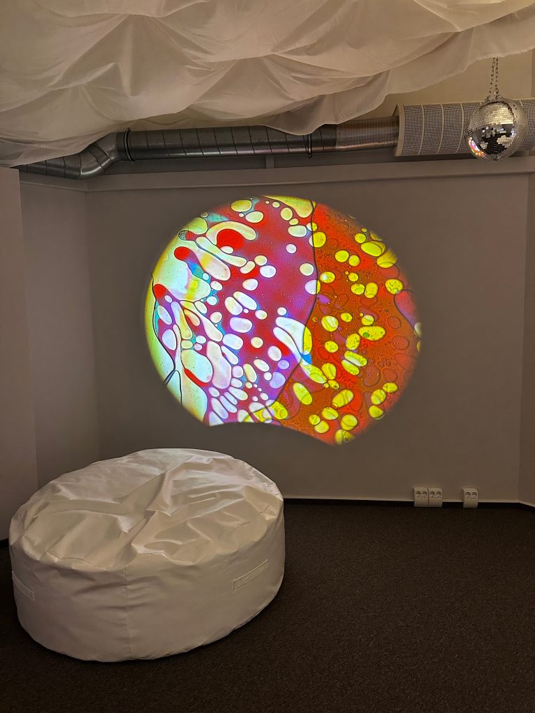 Der Raum ist mit gepolsterten Liege- und Sitzelementen ausgestattet, die unterschiedliche Positionen zum Ausruhen und Zurückziehen ermöglichen. Sanfte Projektionen und der Himmel über der Liegefläche schaffen eine ruhige Atmosphäre, während die verschiedenen Lichteffekte gleichzeitig faszinieren. Es ergibt sich ein multisensorisches Umfeld, das sowohl zur Förderung der Wahrnehmung als auch zur Stressreduktion genutzt werden kann.